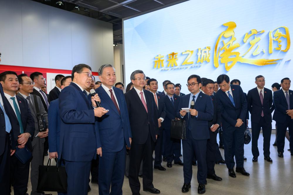 4月14日上午,越共中央总书记、国家主席苏林开始对中国进行为期四天的国事访问。抵达北京后,他随即乘高铁前往雄安新区参访。这是苏林在雄安新区启动区综合服务中心参访。新华社记者 金良快 摄