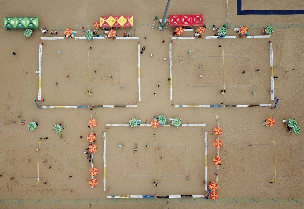 2018年7月19日,2018国际排联世界沙滩排球巡回赛海阳公开赛在山东海阳进行(无人机拍摄)。新华社记者 朱峥 摄