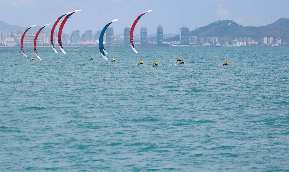 4月27日,第六届亚洲沙滩运动会帆船项目水翼风筝板男子公开系列赛在海南三亚举行。新华社记者 胡星宇 摄